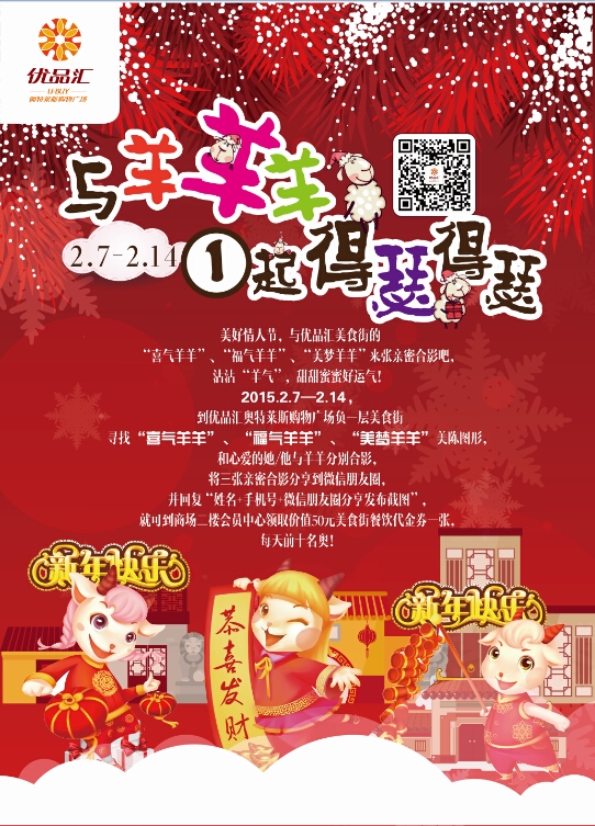 花前月下、你儂我儂,還能沾沾 “羊氣”,浪漫、羊氣的情人節(jié)就在優(yōu)品匯!2月7日—14日,到優(yōu)品匯奧特萊斯負一層美食街尋找“喜氣羊羊”、“福氣羊羊”、“美夢羊羊”吉祥圖形,和心愛的她/他與羊羊羊分別合影,將三張親密合影分享到微信朋友圈,并回復(fù)“姓名+手機號+微信朋友圈分享發(fā)布截圖”,就可到商場二樓會員中心領(lǐng)取50元美食街餐飲代金券一張,每天限前十名奧!