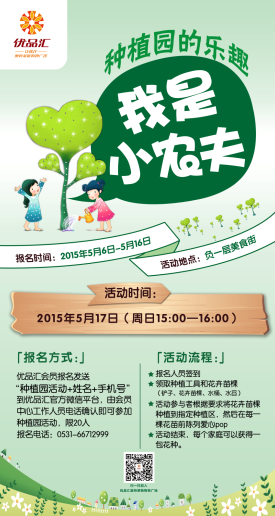 【報名方式】:優品匯會員報名發送“種植園活動+姓名+手機號”到優品匯官方微信平臺,由會員中心工作人員電話確認即可參加種植園活動